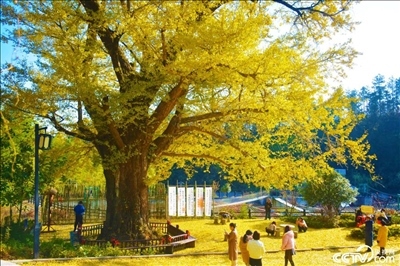 2023年11月25日,安徽安慶,響腸鎮(zhèn)請水寨村千年銀杏樹披“金甲”,進(jìn)入最佳觀賞期,吸引游客前來游玩賞景。