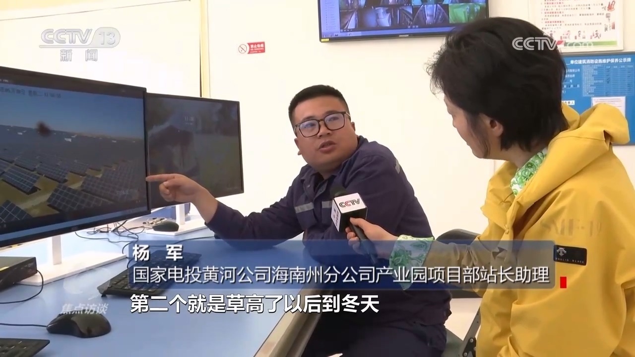 國家電投黃河公司海南州分公司產(chǎn)業(yè)園項目部站長助理楊軍:“光伏板下面這些羊,就是我們請過來幫忙除草的。因為每年一到夏天,園區(qū)電池組件下面草就特別高,長高了以后會遮擋電池組件,一個是影響發(fā)電效率,再一個秋冬季有火災隱患。”