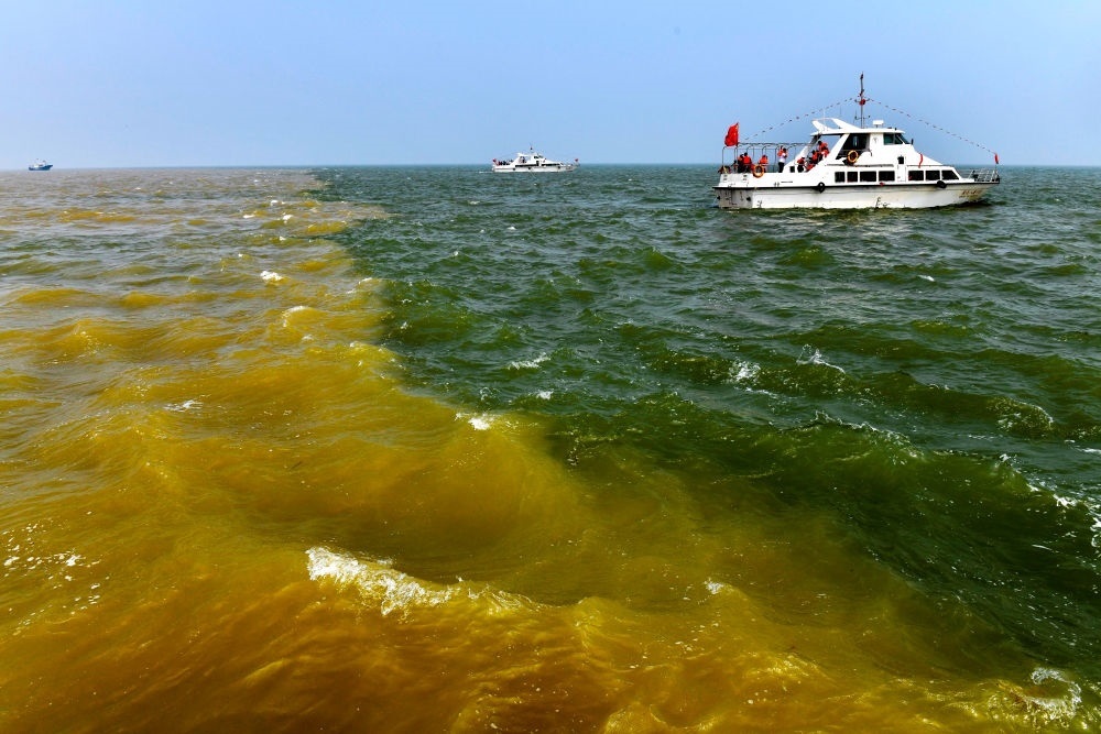 在山東省東營(yíng)市黃河入海口,黃河匯入渤海,形成獨(dú)特景觀(2021年5月13日攝)。