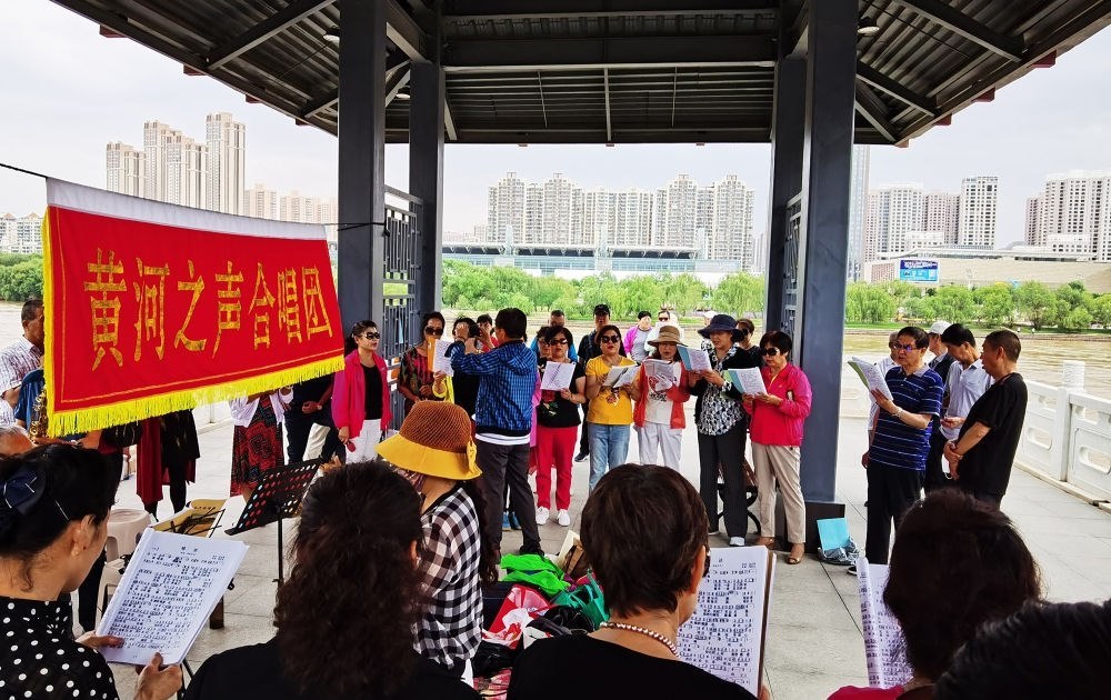 在蘭州市城關(guān)區(qū)黃河治理蘭鐵泵站項(xiàng)目點(diǎn),黃河之聲合唱團(tuán)開(kāi)展合唱活動(dòng)(2020年6月15日攝)。