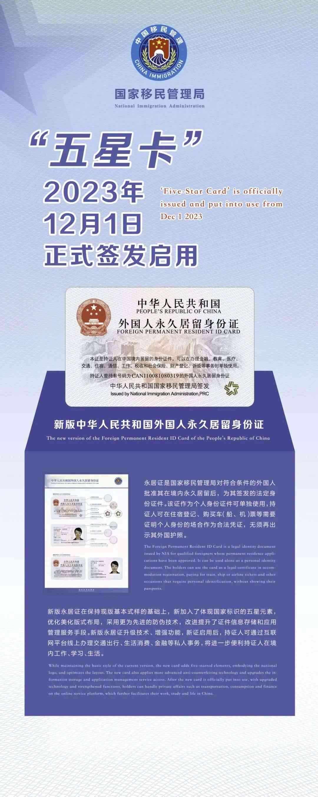 國(guó)家移民管理局相關(guān)負(fù)責(zé)人介紹,“五星卡”由國(guó)家移民管理局簽發(fā),是經(jīng)批準(zhǔn)在中國(guó)境內(nèi)永久居留外國(guó)人的法定身份證件。持證人可在需要證明個(gè)人身份的場(chǎng)合作為個(gè)人身份憑證單獨(dú)使用,無(wú)須再出示其外國(guó)護(hù)照。“五星卡”優(yōu)化了證件信息存儲(chǔ)方式,美化了版式布局,采用了更為先進(jìn)的防偽技術(shù),增強(qiáng)了個(gè)人信息保護(hù)和數(shù)據(jù)安全性。國(guó)家移民管理局會(huì)同有關(guān)部門(mén)大力推進(jìn)各相關(guān)行業(yè)領(lǐng)域應(yīng)用系統(tǒng)、設(shè)施設(shè)備的適配性升級(jí)改造,便于持證人在交通出行、生活消費(fèi)、金融通信等公共服務(wù)、政務(wù)服務(wù)領(lǐng)域和互聯(lián)網(wǎng)平臺(tái)使用。