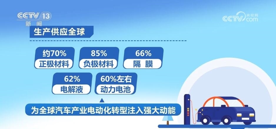工業(yè)和信息化部表示,我國已建立了結(jié)構(gòu)完整、有機(jī)協(xié)同的新能源汽車產(chǎn)業(yè)鏈、供應(yīng)鏈體系,涵蓋基礎(chǔ)材料、零部件、整車、制造裝備等全鏈條,生產(chǎn)供應(yīng)了全球約70%的正極材料、85%的負(fù)極材料、66%的隔膜、62%的電解液以及60%左右的動(dòng)力電池,為全球汽車產(chǎn)業(yè)電動(dòng)化轉(zhuǎn)型注入了強(qiáng)大動(dòng)能。