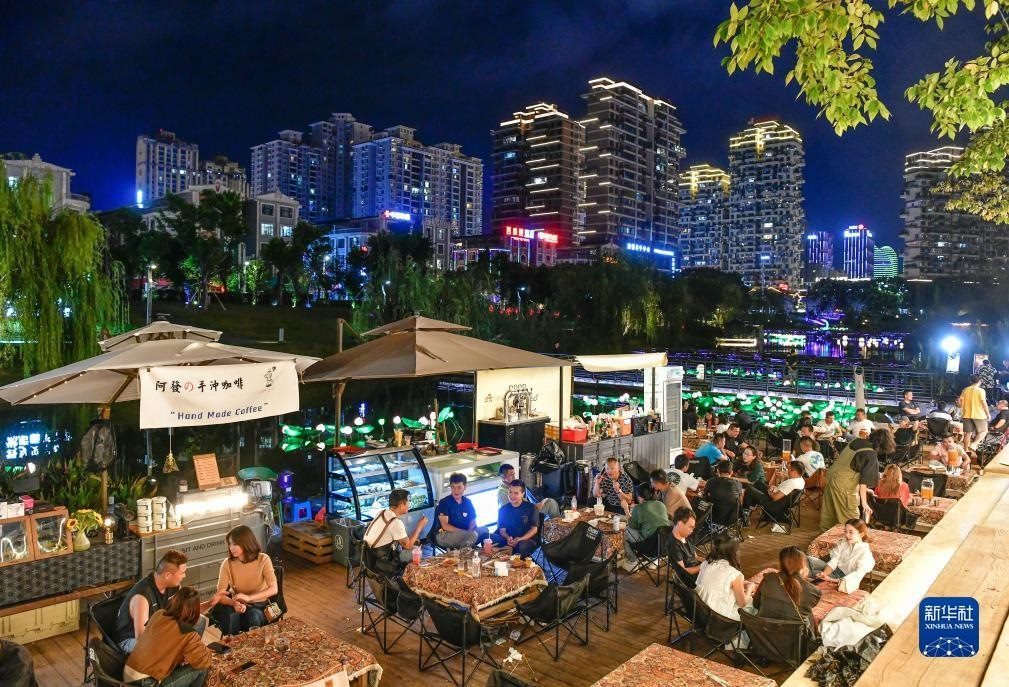 2023年9月14日,游客和市民在貴州省黔西南布依族苗族自治州興義市馬嶺河夜間消費聚集區(qū)休閑。新華社記者 楊文斌 攝