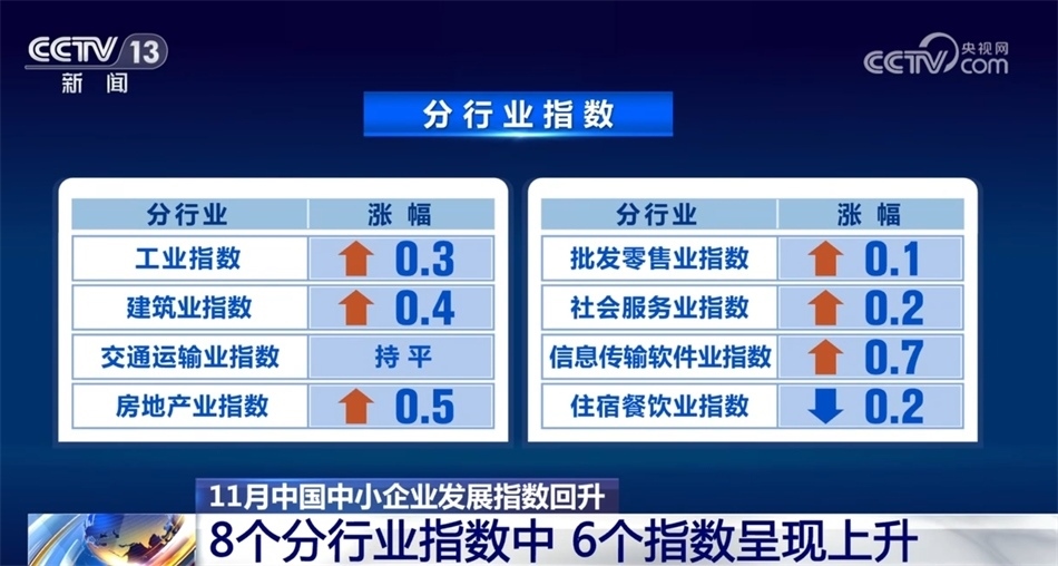 央視網(wǎng)消息:中國中小企業(yè)協(xié)會今天(12月10日)發(fā)布,11月中國中小企業(yè)發(fā)展指數(shù)上升0.2點。各分項指數(shù)均無下跌,分行業(yè)指數(shù)則是6升1平1降。