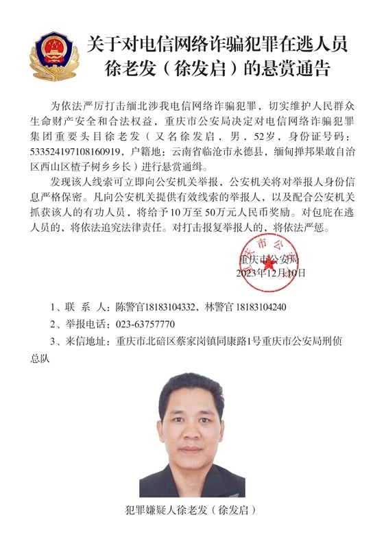 為依法嚴(yán)厲打擊緬北涉我電信網(wǎng)絡(luò)詐騙犯罪,切實(shí)維護(hù)人民群眾生命財(cái)產(chǎn)安全和合法權(quán)益,遼寧省大連市公安局決定對(duì)白所成、白應(yīng)蒼(又名李云晨)、白應(yīng)蘭(又名李夢(mèng)娜)進(jìn)行公開懸賞通緝;福建省泉州市公安局決定對(duì)魏懷仁、魏榕(又名陳榕)、魏青松(又名楊松)進(jìn)行公開懸賞通緝;福建省龍巖市公安局決定對(duì)劉正祥、劉積光(又名李華光)、劉正茂進(jìn)行公開懸賞通緝;重慶市公安局決定對(duì)徐老發(fā)(又名徐發(fā)啟)進(jìn)行公開懸賞通緝。