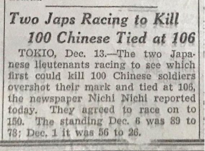 “根據(jù)《東京日日新聞》報(bào)道,兩名日本軍官比賽看誰能先殺死100名中國(guó)士兵,結(jié)果都?xì)⒘顺^100人,雙方打平殺了106人,他們又同意重新比賽殺到150人為止,12月6日是89比78,12月1日是56比26?!边@是1937年12月14日發(fā)行的《芝加哥每日論壇》中,一篇有關(guān)兩名日本軍官進(jìn)行“百人斬”殺人競(jìng)賽的報(bào)道節(jié)選。