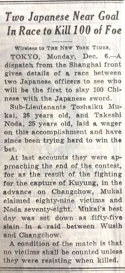 在1937年12月6日發(fā)行的《紐約時(shí)報(bào)》中,也登載了有關(guān)日軍“百人斬”殺人競(jìng)賽的報(bào)道。報(bào)道稱,來自上海前線的一份電報(bào)詳細(xì)介紹了兩名日本軍官之間的一場(chǎng)比賽,看誰先殺死100名中國(guó)人。年紀(jì)分別為25歲和26歲的日本軍官把賭注壓在了這項(xiàng)“成就”上。