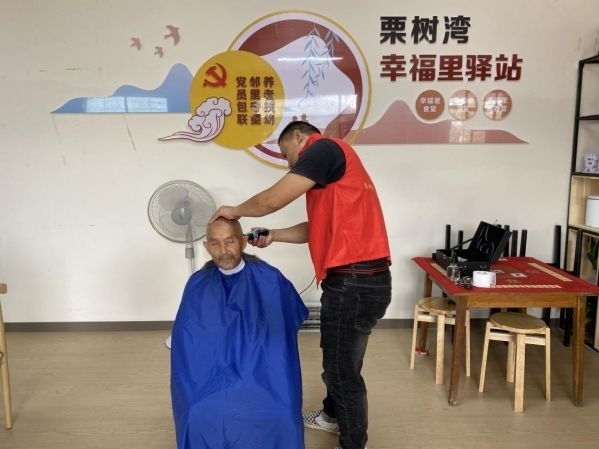 荊門市東寶區(qū)栗溪鎮(zhèn)栗樹灣村留守老人在“養(yǎng)老服務驛站”享受免費理發(fā)服務