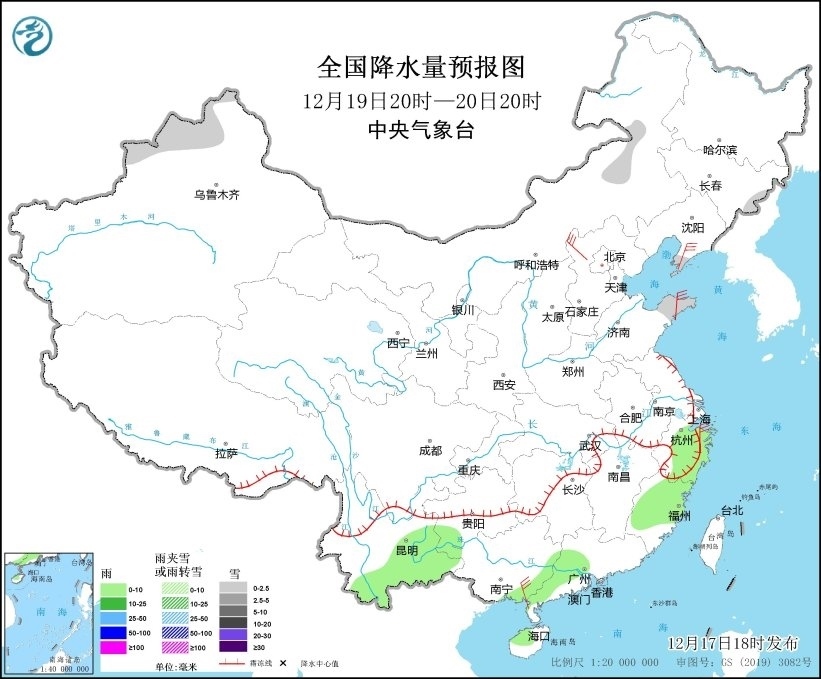 圖6 全國降水量預(yù)報圖(12月19日20時-20日20時)