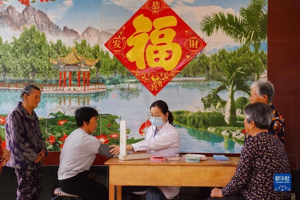 河北省平鄉(xiāng)縣尋召村村醫(yī)在“幸福小院”內(nèi)為老人們量血壓(2023年4月20日攝)。近年來,河北省平鄉(xiāng)縣利用農(nóng)村閑置院落,按照“就近集中、鄰里互助、抱團(tuán)養(yǎng)老”的模式,采取社會捐助、鄉(xiāng)村籌集、縣財政補助等形式,先后打造出300余個“幸福小院”。新華社記者 牟宇 攝