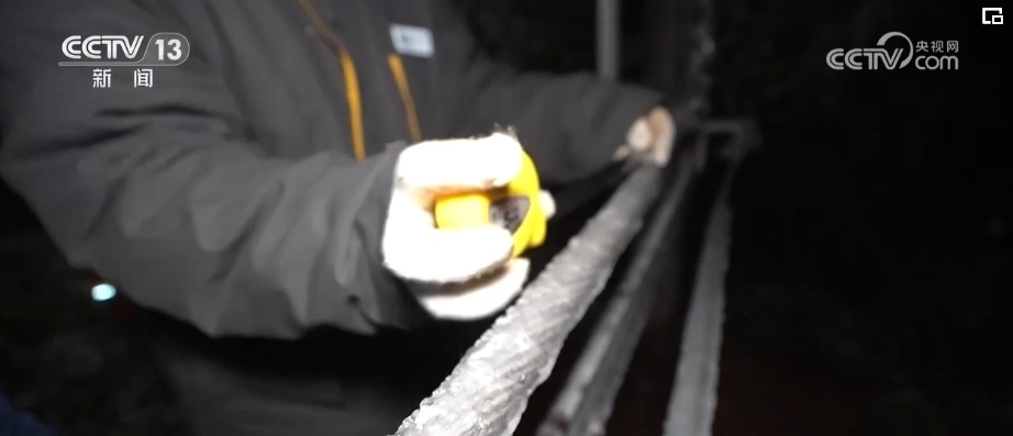 根據(jù)現(xiàn)場(chǎng)檢測(cè),現(xiàn)在導(dǎo)線上的覆冰已經(jīng)超過了18毫米,融冰工作也正式開始。老廖告訴記者,他們采用的是導(dǎo)電加熱融冰的手段,通過對(duì)導(dǎo)線進(jìn)行增加大電流,自動(dòng)加熱,從而讓冰融化,但這一過程有時(shí)候要等很久。