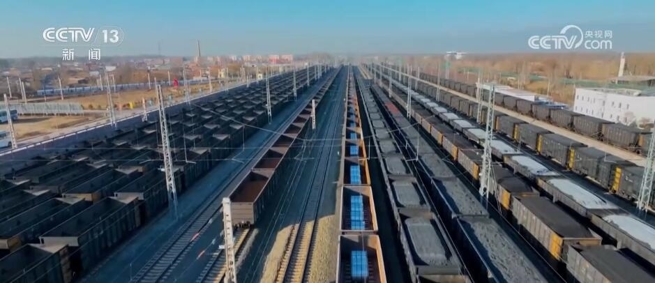 總臺記者 薛東海:我現(xiàn)在是在呼和浩特南站,在我身邊這些滿載著煤炭的列車,每節(jié)車體可以裝載80噸的煤炭,整個列車是有105節(jié)車體組合而成,(煤炭)總重量可以達到8400余噸,再加上車身自身重量,整個列車可以達到1萬噸以上。