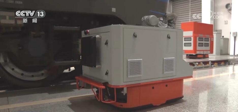 總臺記者 薛東海:列車途徑沿線隧道眾多,從而行駛過程當中會積攢大量煤灰、粉塵,影響列車的安全。也意味著當列車行駛到一段距離之后,就要來到庫區(qū)進行維修和除塵工作。曾經這項主要是依賴于人工,需要四名工人來到溝底進行吹除作業(yè)。到了今年,這樣的工作被我旁邊的這個“小家伙”智能機器人取代了。