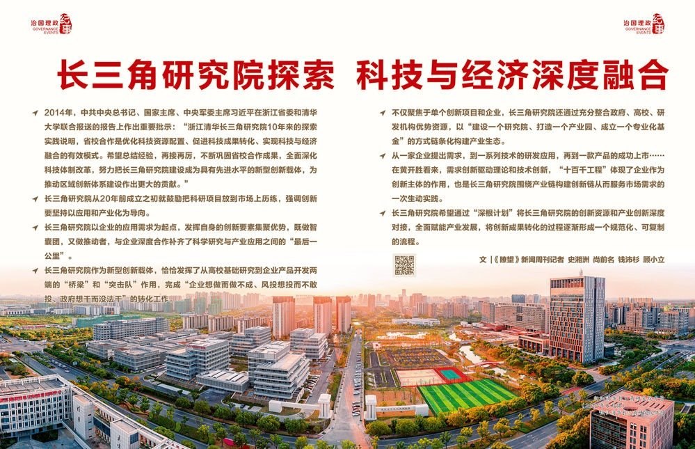 2003年底,在時(shí)任浙江省委書記習(xí)近平的親自推動(dòng)下,浙江清華長三角研究院(以下簡稱“長三角研究院”)正式成立,落地浙江嘉興。作為浙江省人民政府與清華大學(xué)共建的新型創(chuàng)新載體,長三角研究院成立以來立足浙江、面向長三角,以自收自支、市場化運(yùn)營探索走出一條省校合作的有效模式,逐步成長為長三角區(qū)域重要的產(chǎn)學(xué)研試驗(yàn)平臺和成果轉(zhuǎn)化基地。