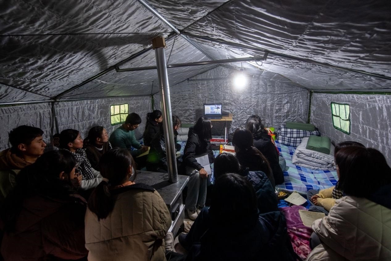 12月22日,在積石山縣大河家鎮(zhèn)大河村安置點(diǎn),部分高中學(xué)生在帳篷中聽課。人民網(wǎng)記者 翁奇羽攝