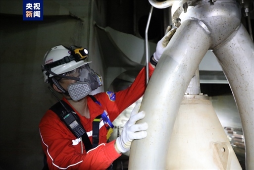 △“深海一號(hào)”現(xiàn)場(chǎng)作業(yè)人員正在對(duì)凝析油艙內(nèi)浸沒(méi)泵等設(shè)備狀態(tài)進(jìn)行檢查維保