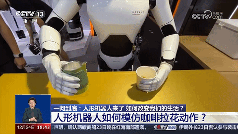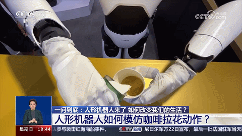 2023年8月,2023世界機(jī)器人大會(huì)在北京開幕,現(xiàn)場(chǎng)有個(gè)人形機(jī)器人可以模仿“咖啡拉花”動(dòng)作——開始,把兩個(gè)杯子(裝有咖啡、牛奶)遞給人形機(jī)器人;稍后,人形機(jī)器人運(yùn)行AI智能算法,指揮它用“手”完成“咖啡拉花”作業(yè)。