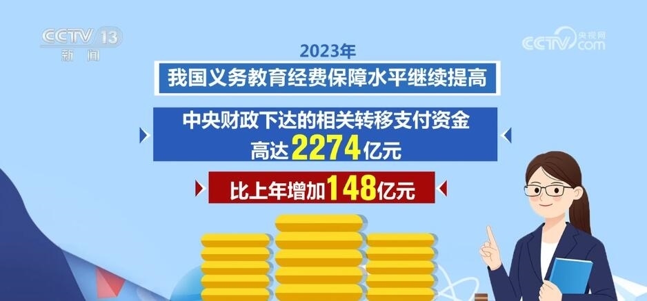 2023年,我國義務(wù)教育經(jīng)費(fèi)保障水平繼續(xù)提高,中央財(cái)政下達(dá)的相關(guān)轉(zhuǎn)移支付資金高達(dá)2274億元,比上年增加148億元。2023年,一系列義務(wù)教育重大工程項(xiàng)目繼續(xù)實(shí)施,讓中小學(xué)辦學(xué)條件不斷優(yōu)化。其中,義務(wù)教育薄弱環(huán)節(jié)改善與能力提升項(xiàng)目中央安排330億元,支持各地義務(wù)教育學(xué)校標(biāo)準(zhǔn)化建設(shè)。