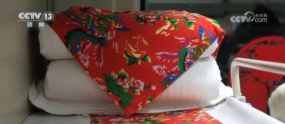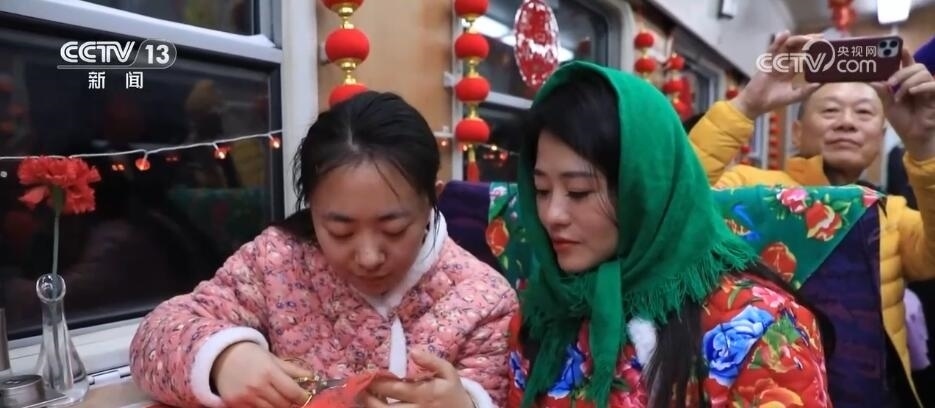總臺(tái)央視記者 楊曜語:一上車,我就被濃濃的東北文化所感染到了,整個(gè)車廂都被東北大花的經(jīng)典配色裝飾著,再加上隨手就能品嘗到的特色美食,坐在床鋪上就感覺一秒鐘“穿越”到農(nóng)家炕頭。跟著游客,我現(xiàn)在到了一節(jié)互動(dòng)車廂,這里被布置成“跨年狂歡”的主題場景,在這里游客可以參與剪窗花、包餃子、穿東北大花襖一系列特色活動(dòng),現(xiàn)在就有很多游客在這里打卡拍照。