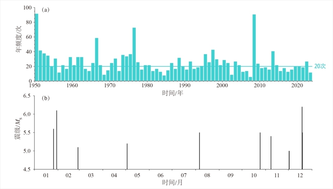 2023年以來大陸地區(qū)發(fā)生5級以上地震11次,最大為12月18日甘肅積石山6.2級地震,活動(dòng)水平較2022年(27次,最大為2022年1月8日青海門源6.9級地震)和歷史平均水平(20次)明顯偏弱(圖a)。2023年5級以上地震時(shí)間分布不均勻,1月至2月發(fā)生3次,3月至9月僅發(fā)生2次,10月至12月增至6次,出現(xiàn)5級以上地震由弱轉(zhuǎn)強(qiáng)的活動(dòng)特征(圖b)。