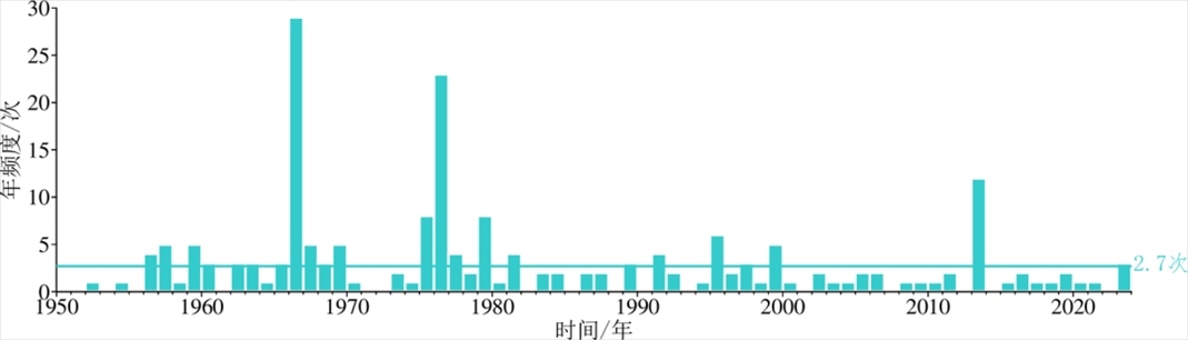 2023年以來大陸東部及附近海域發(fā)生5級以上地震3次,分別為6月24日北部灣5.0級、8月6日山東平原5.5級和10月23日廣東南澳縣海域5.0級地震,地震活動(dòng)水平較2022年(0次)顯著增強(qiáng),為 2014 年以來活動(dòng)頻次最高年份。