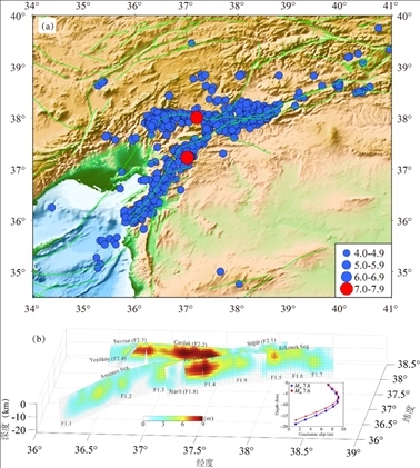 土耳其兩次7.8級地震及其余震分布(a)和兩次主震的滑動(dòng)位移分布(b)