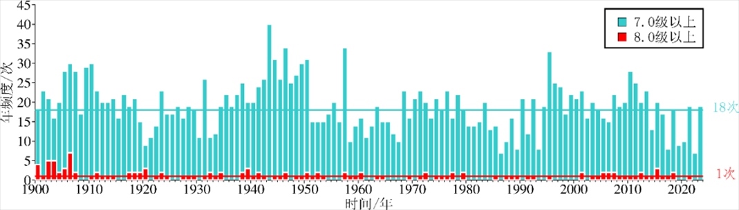 2023年全球未發(fā)生8級以上地震,最近一次為2021年7月29日美國阿拉斯加以南海域8.1級地震。2023年全球發(fā)生7級以上地震19次,與1900 年以來年均頻次(18 次)基本持平,顯著高于2022年7級以上地震的活動(dòng)水平(7次)。