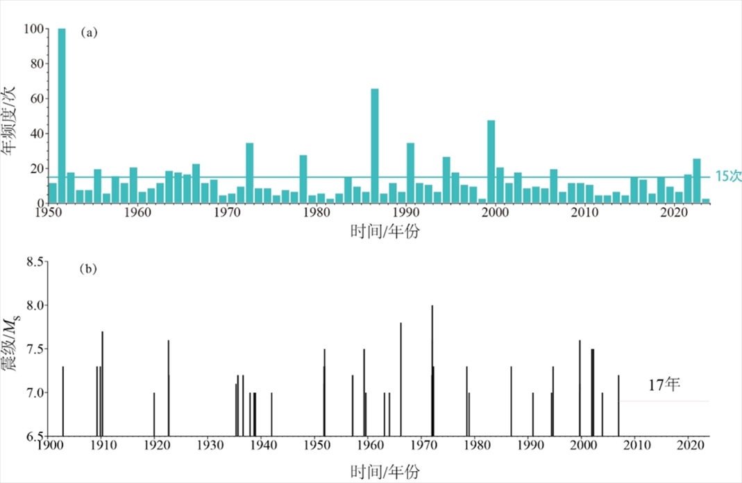 2023年大陸5級以上地震時(shí)序圖(b)