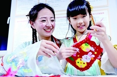 浙江省杭州市上城區(qū)丁蘭街道五會港社區(qū),社區(qū)工作者和小朋友一起制作中秋福袋。周方玲攝/光明圖片