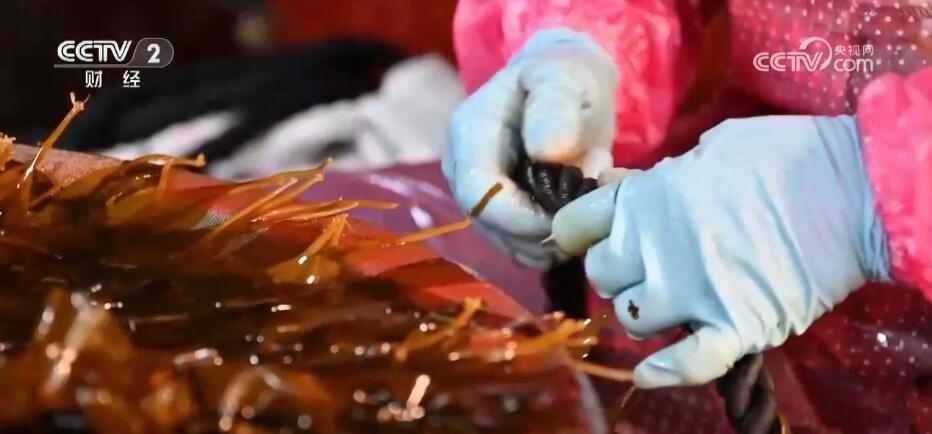 村民們介紹,一根將近7米長(zhǎng)的繩子可以?shī)A130條海帶苗。把海帶苗夾好之后會(huì)統(tǒng)一裝船,運(yùn)往興化灣海域的養(yǎng)殖區(qū)養(yǎng)殖。