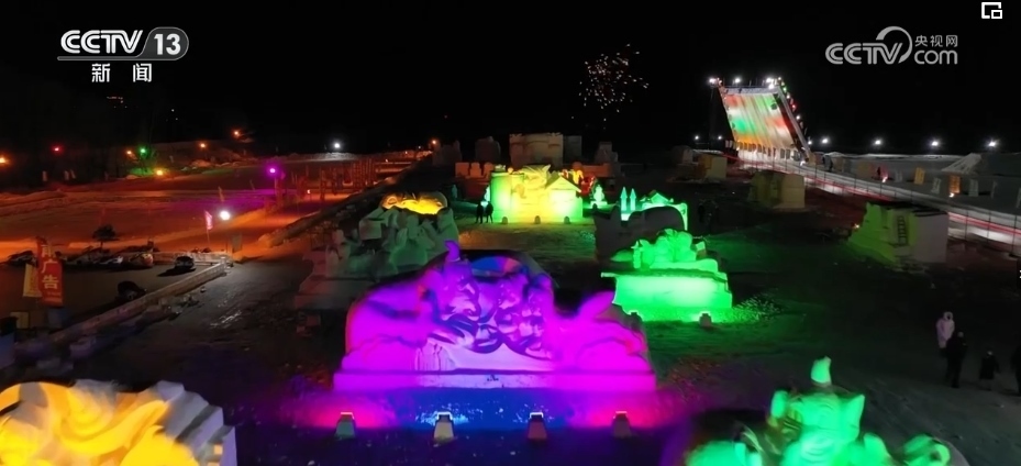 夜幕降臨,富錦市冰雪樂(lè)園一片流光溢彩,40余座雪雕景觀將童話里的人物搬到了現(xiàn)實(shí)。雪地大滑梯、雪地摩托車(chē)等娛樂(lè)項(xiàng)目也吸引了眾多游客前來(lái)游玩。