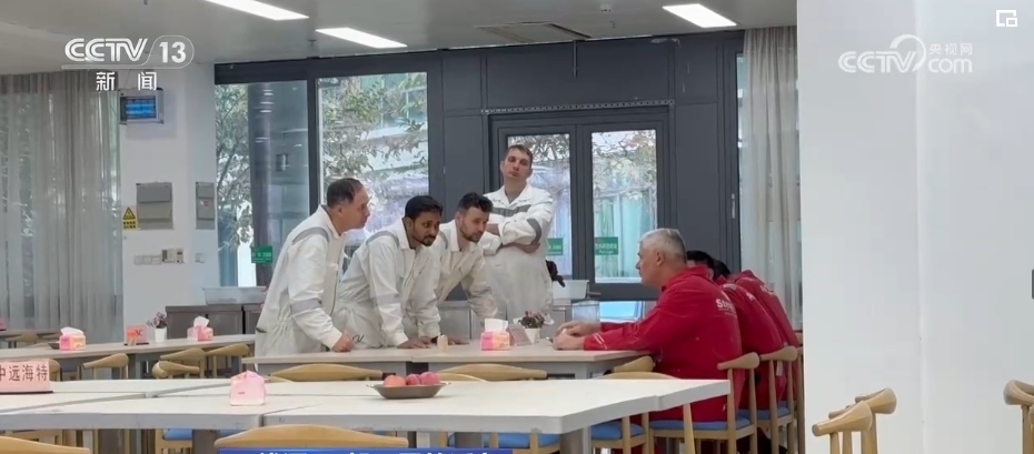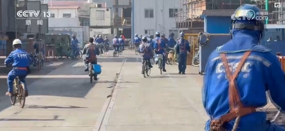 一輛輛各式各樣的自行車平穩(wěn)穿梭在安全區(qū),車上的工友有事兒就會(huì)互相召喚,拿出圖紙解決問題,互通有無。而在職工和船東餐廳里,一張張餐桌上分區(qū)標(biāo)記了各個(gè)業(yè)主單位。吃完飯撤掉餐具,大家就開始“頭腦風(fēng)暴”,現(xiàn)場(chǎng)辦公。