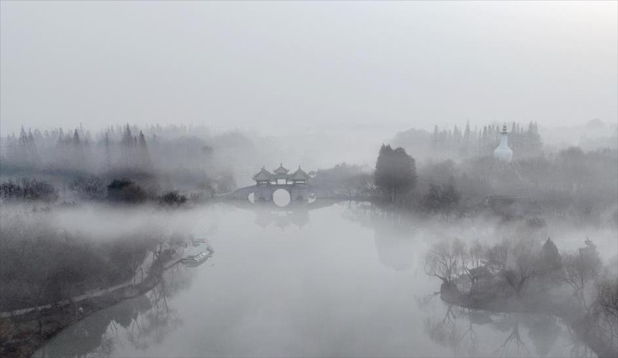 2024年1月6日,江蘇揚州,瘦西湖風景區(qū)在晨霧中若隱若現,宛如一幅水墨畫卷,美不勝收。