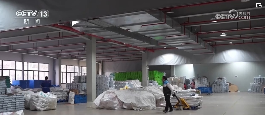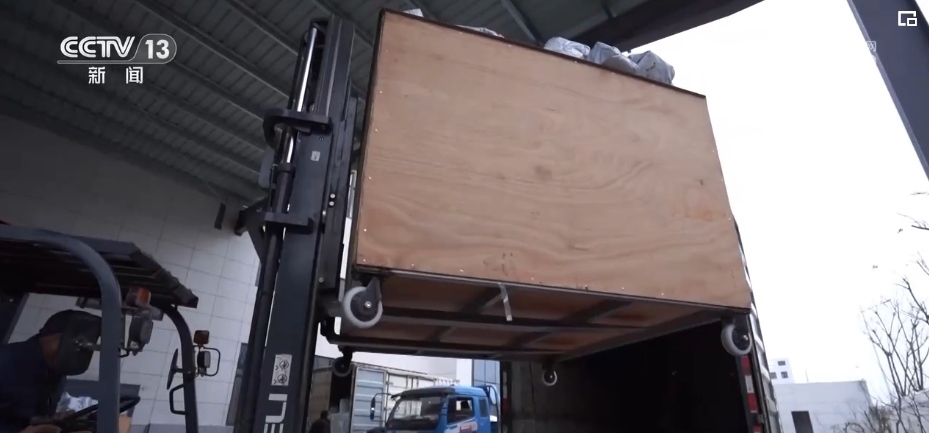 在浙江長(zhǎng)興的一家企業(yè)廠房里,廠家工作人員根據(jù)訂單快速分發(fā)、貼單、裝貨;快遞小哥則在一樓出貨區(qū),將叉車(chē)上的貨物運(yùn)上郵政貨車(chē)。