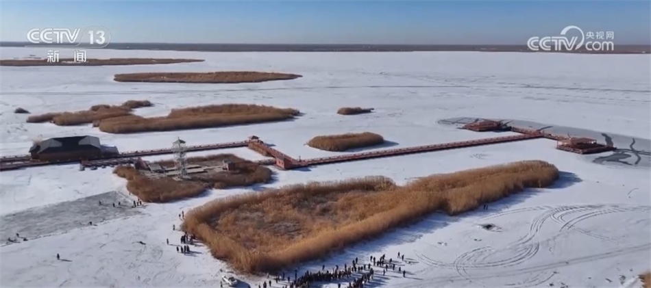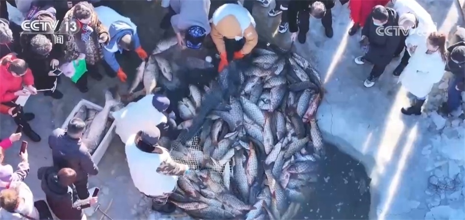 總臺(tái)記者? 阮超:我現(xiàn)在是烏梁素海的冰面上,我身邊就是此次冬捕的出魚(yú)口。隨著漁網(wǎng)緩緩拉動(dòng),水面下的魚(yú)被不斷運(yùn)送到冰面上來(lái)。