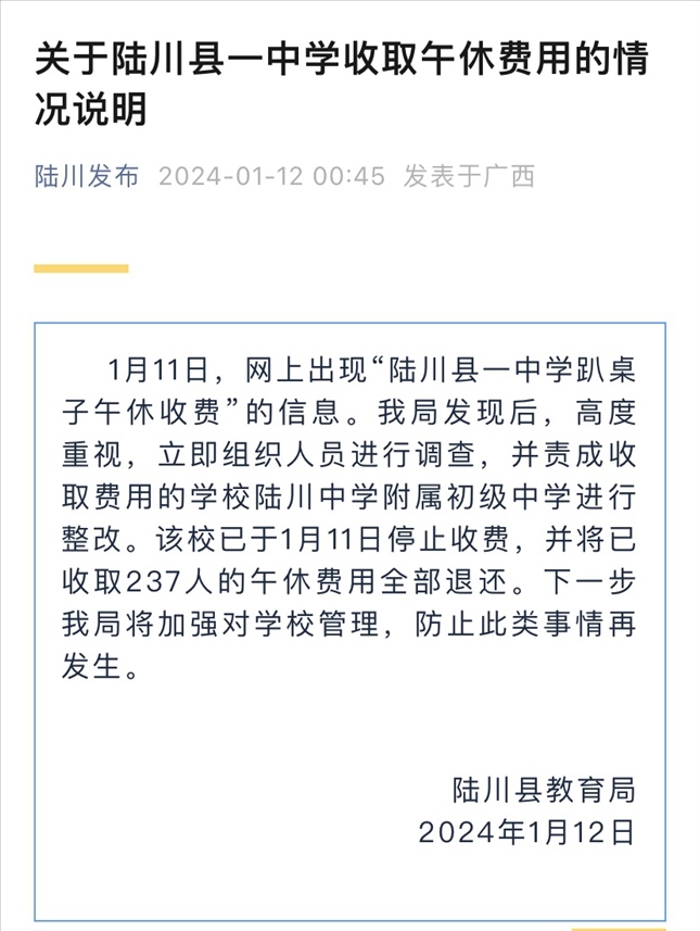 ·廣西陸川一中學收取“趴桌費”?當?shù)亟逃郑贺煶蓪W校整改,已退還全部費用。