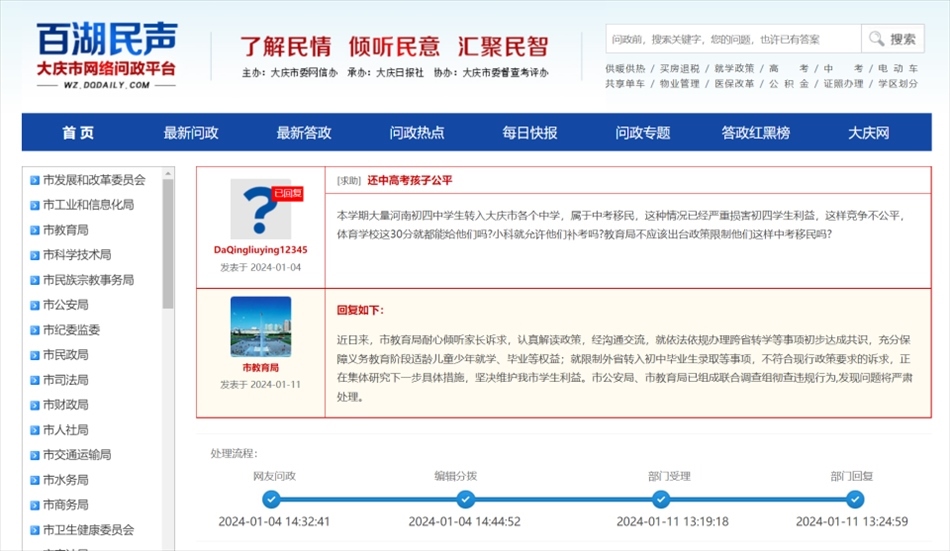 ·家長稱大量河南中學生“中考移民”至黑龍江大慶各個中學,官方回應:暫時關(guān)閉學籍系統(tǒng),成立聯(lián)合調(diào)查組徹查違規(guī)行為。