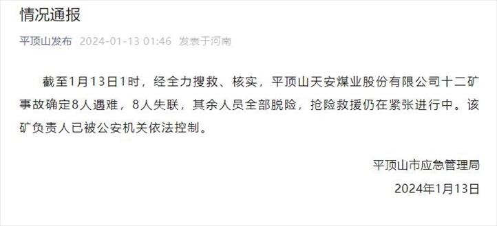 ·河南平頂山煤礦事故已致8人遇難8人失聯(lián),該礦負責人已被控制。