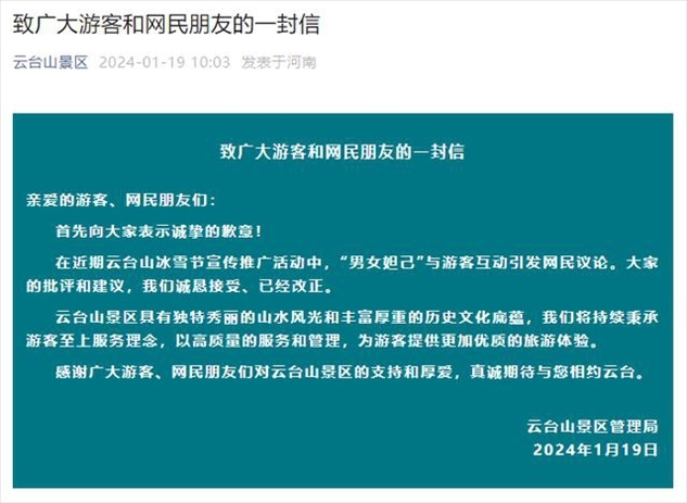 ·云臺山景區(qū)就“男女妲己”道歉:向大家表示誠摯的歉意,已經(jīng)改正。