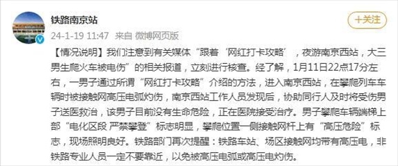 ·南京站回應(yīng)“大學(xué)生爬火車打卡被燒傷進ICU”:男子無生命危險,接觸網(wǎng)均有高壓電非專業(yè)人員不要靠近。