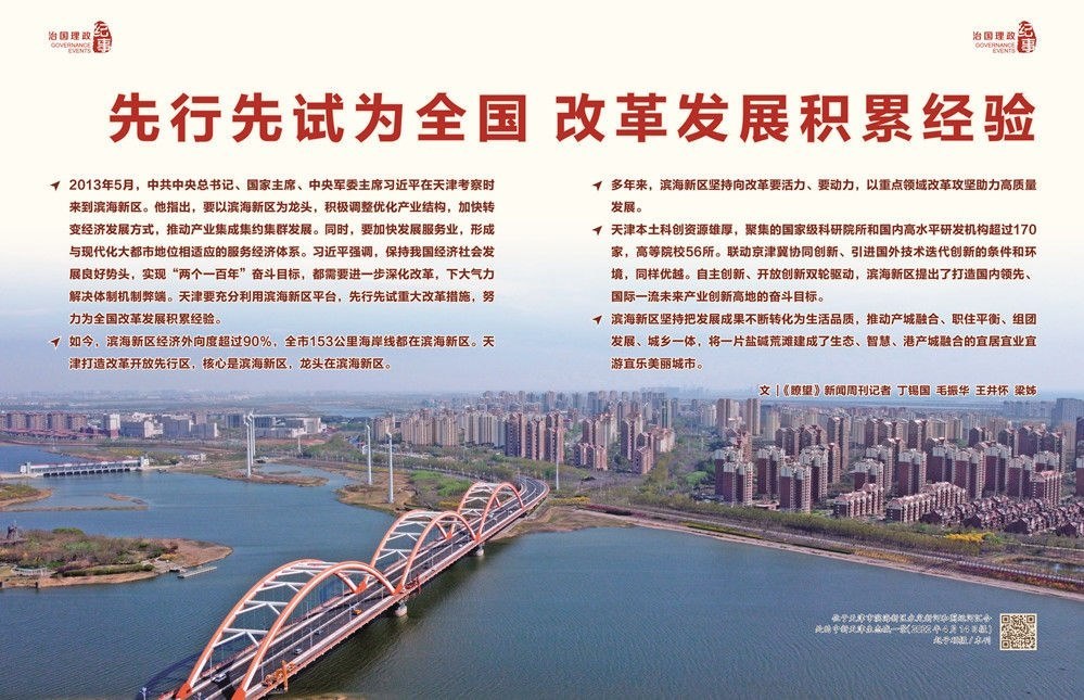 ◇2013年5月,中共中央總書記、國(guó)家主席、中央軍委主席習(xí)近平在天津考察時(shí)來到濱海新區(qū)。他指出,要以濱海新區(qū)為龍頭,積極調(diào)整優(yōu)化產(chǎn)業(yè)結(jié)構(gòu),加快轉(zhuǎn)變經(jīng)濟(jì)發(fā)展方式,推動(dòng)產(chǎn)業(yè)集成集約集群發(fā)展。同時(shí),要加快發(fā)展服務(wù)業(yè),形成與現(xiàn)代化大都市地位相適應(yīng)的服務(wù)經(jīng)濟(jì)體系。習(xí)近平強(qiáng)調(diào),保持我國(guó)經(jīng)濟(jì)社會(huì)發(fā)展良好勢(shì)頭,實(shí)現(xiàn)“兩個(gè)一百年”奮斗目標(biāo),都需要進(jìn)一步深化改革,下大氣力解決體制機(jī)制弊端。天津要充分利用濱海新區(qū)平臺(tái),先行先試重大改革措施,努力為全國(guó)改革發(fā)展積累經(jīng)驗(yàn)。