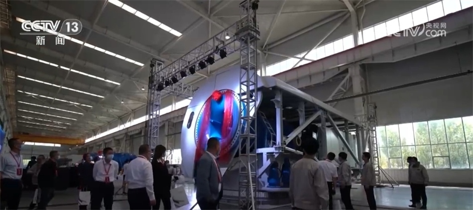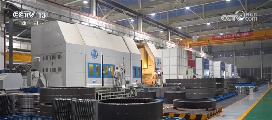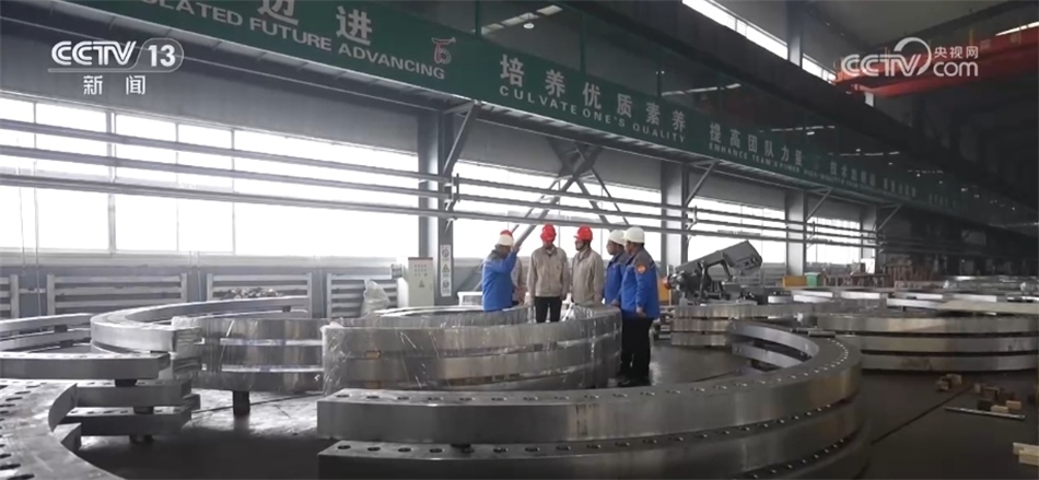 總臺央視記者 古峻嶺:這個大家伙叫輪轂,就是風機葉輪中間這個位置,就是它把重達百噸的3支葉片牢牢固定在風機之上。采用傳統(tǒng)人工的方式,需要2個人花上180分鐘才能安裝完,現(xiàn)在只需要80分鐘即可完成。傳統(tǒng)定點裝配模式一天只能裝配3—4臺主機,而在現(xiàn)在的流水線上作業(yè),一天則可以裝配6—8臺主機,效率翻倍,但是用工卻減少了一半。