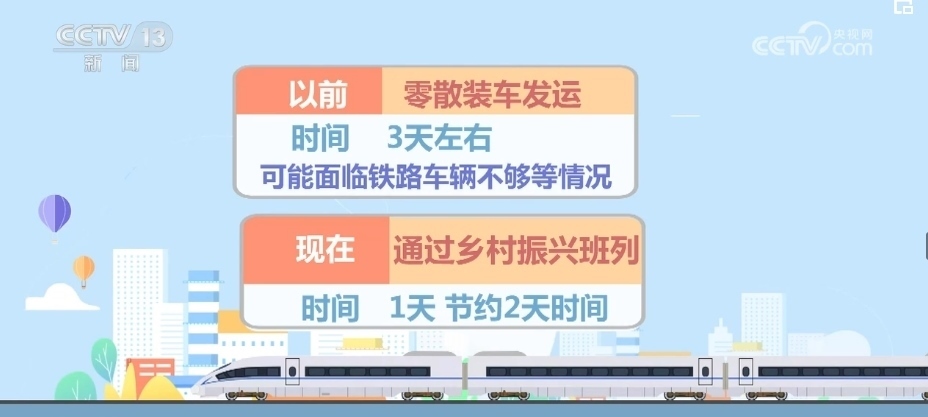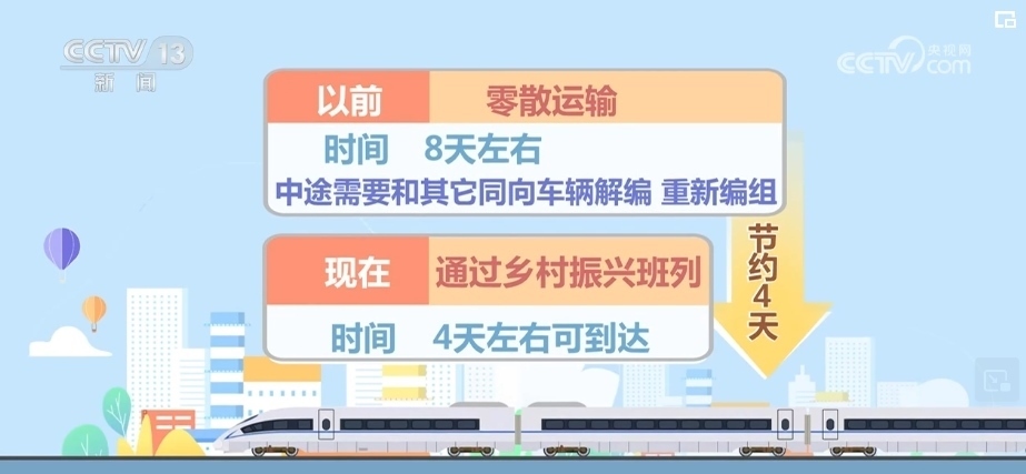 路上耗時,以前零散運輸需要8天左右,中途需要和其他同向車輛解編、重新編組,現(xiàn)在通過鄉(xiāng)村振興班列4天左右可以到達,這就節(jié)約了4天時間。