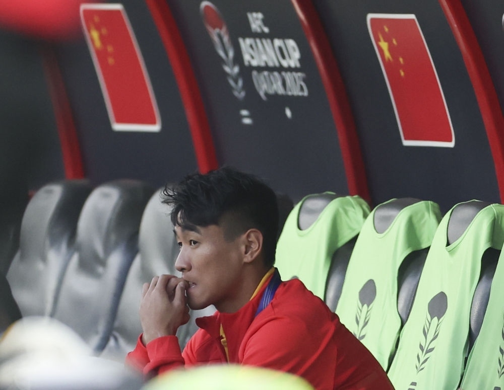 1月13日,中國隊對陣塔吉克斯坦隊,圖為因傷未能進入名單的韋世豪賽前在替補席上。新華社記者 曹燦 攝