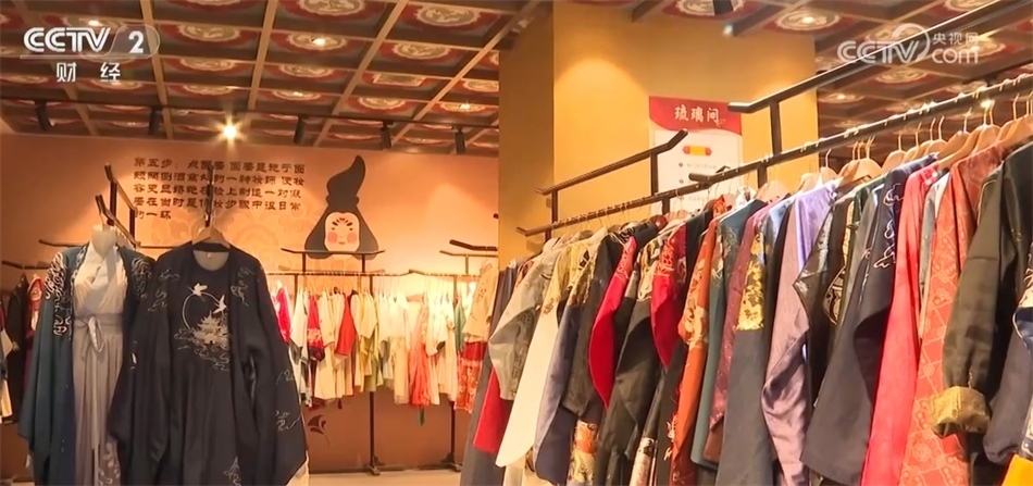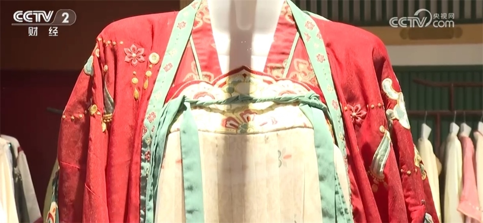 總臺記者 秦祎:我旁邊的這件就是店內(nèi)最受歡迎的唐裝之一——花想容,這件衣服里面是一件唐裝的基礎款造型齊胸襦裙,披上外披則是貴妃造型,如果擔心天氣冷可以像我一樣加上斗篷。
