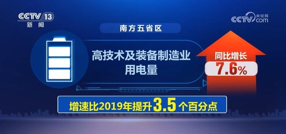 而在南方電網(wǎng)經營區(qū)域內的廣東、廣西等五省區(qū),高技術及裝備制造業(yè)用電量同比增長7.6%,增速比2019年提升3.5個百分點,反映工業(yè)經濟轉型升級態(tài)勢加快。