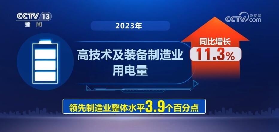 來自中國電力企業(yè)聯(lián)合會數(shù)據(jù)顯示,2023年,高技術及裝備制造業(yè)用電量同比增長11.3%,領先制造業(yè)整體水平3.9個百分點。