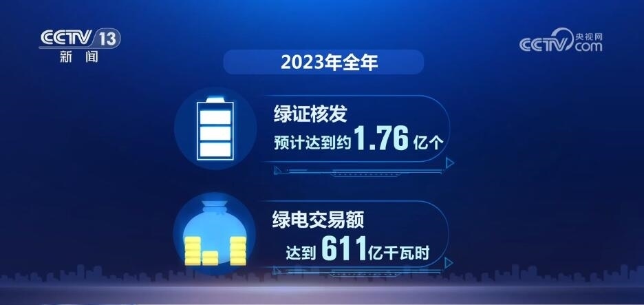 全覆蓋,是2023年我國綠電消費的一大關鍵詞。通過給已建檔立卡的可再生能源發(fā)電項目全部核發(fā)綠證,我國成為全球最大的綠證供應市場。全年綠證核發(fā)預計達到約1.76億個,綠電交易額達到611億千瓦時,分別是2022年的7.8倍和10.5倍。