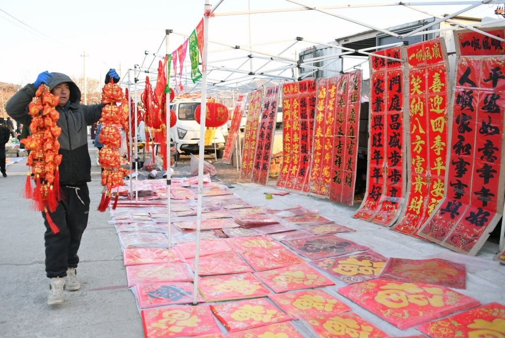 2024年1月27日,在北京市平谷區(qū)金海湖鎮(zhèn)靠山集大集,商戶在布置攤位。新華社記者 任超 攝