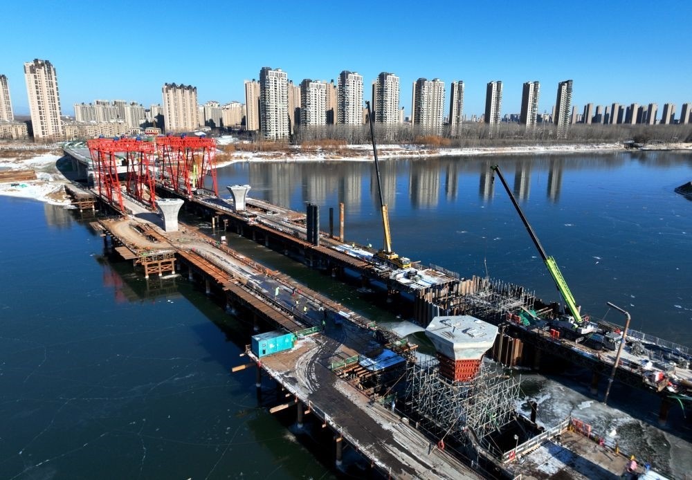 這是廠通路(河北省大廠回族自治縣至北京市通州區(qū))潮白河大橋施工現(xiàn)場(chǎng)(2023年12月21日攝,無(wú)人機(jī)照片)。新華社記者 王曉 攝